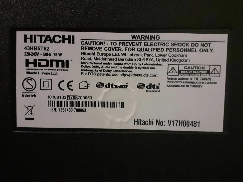 HITACHI 43” MODEL. 43HB5T62 Smart TV – Internet
