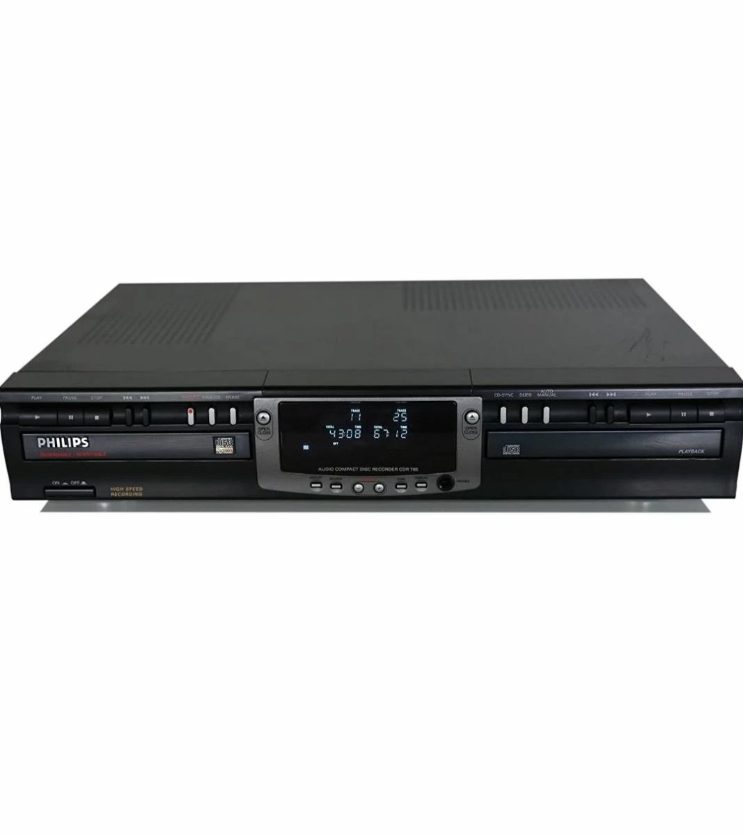 PHILIPS CDR 765, διπλό στερεοφωνικό cd PLAYER με δυνατότητα αναπαραγωγής και εγγράφεις. SPDIF input, SPDIF output, audio line-in, audio line-out, headphones JAC. Το PHILIPS CDR 765 περιέχει και τηλεκοντρόλ για πιο εύκολη χρήση.